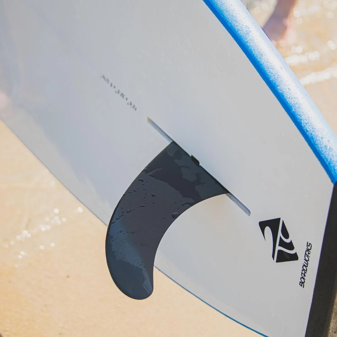 This is Boardworks flexible version of the classic 9โ all-around dolphin fin shape for longboards and standup paddleboards for safety and shallow water use. Made from a less-rigid polymer designed to flex for safety and to minimize fin box damage due to unintentional impacts with rocks, reef, shore, etc. Compatible with all US-style standup paddleboard and longboard center fin boxes as well as Air7 inflatable SUP fin boxes