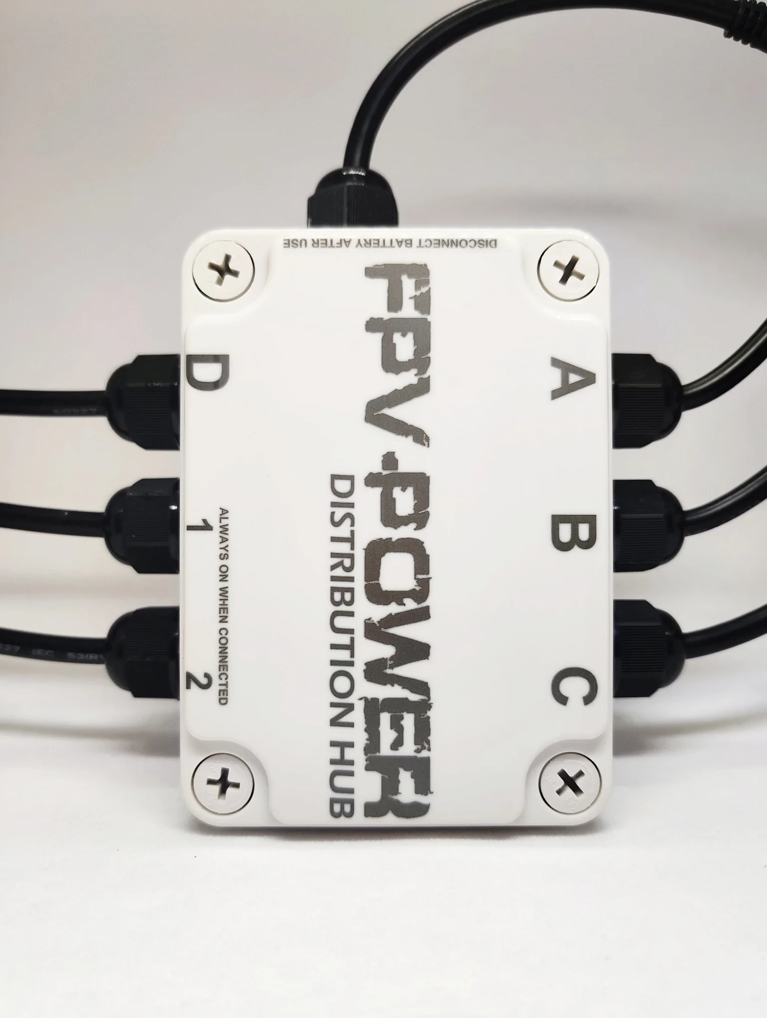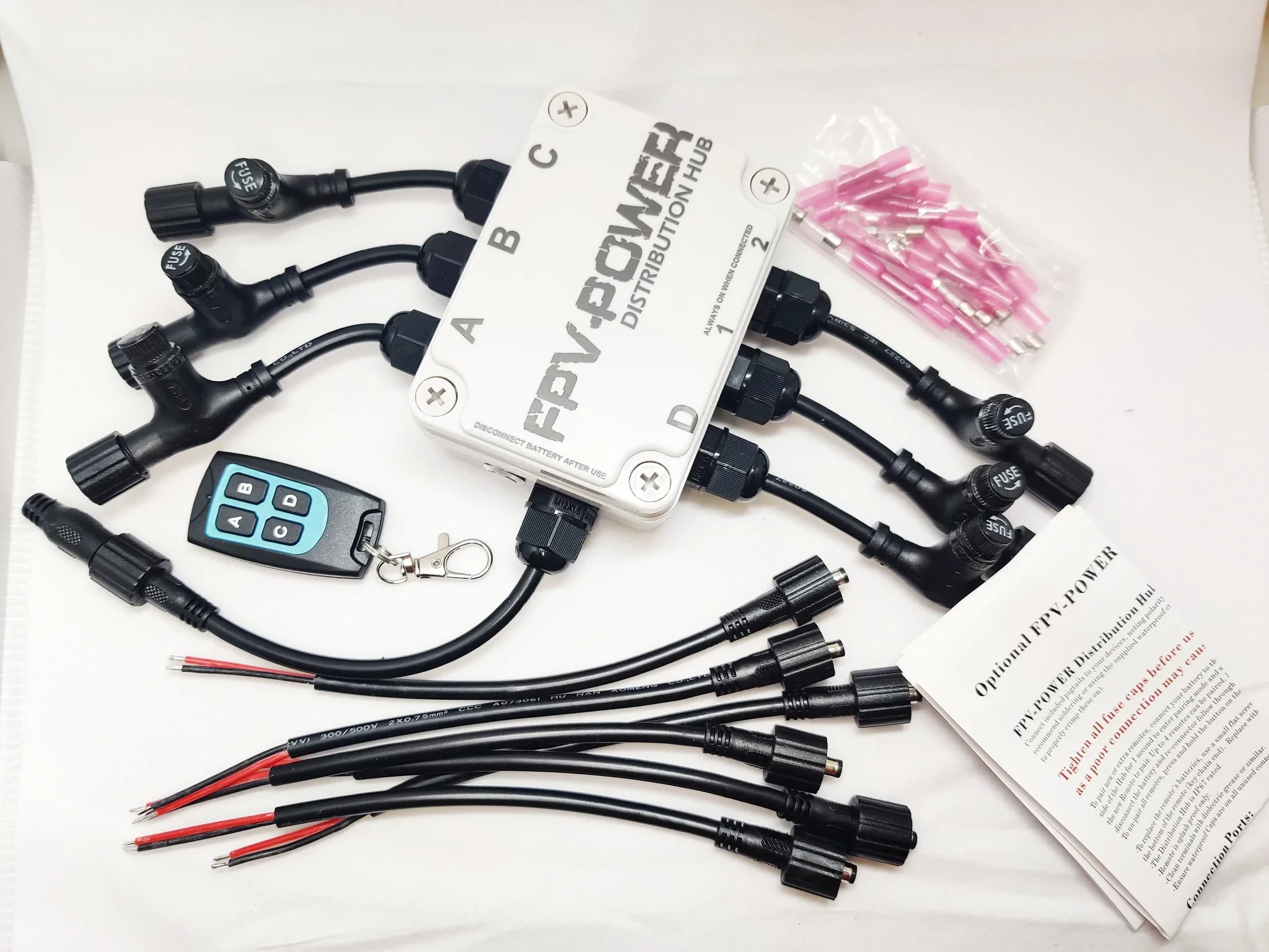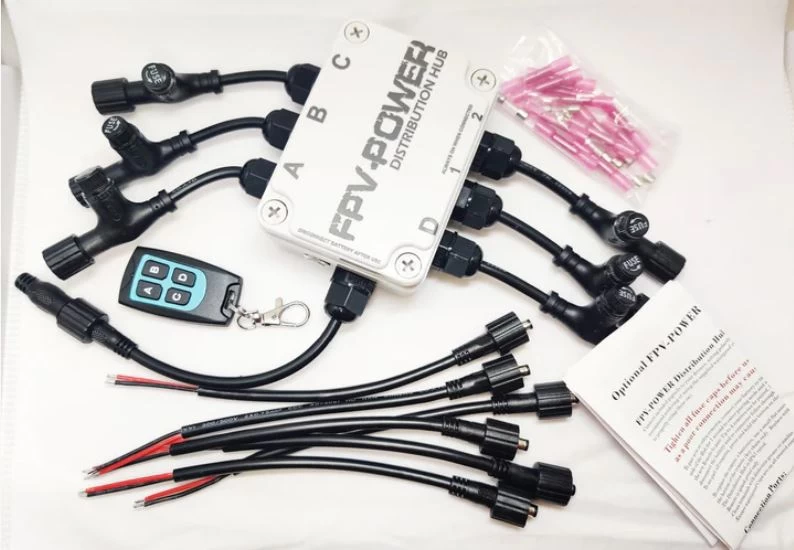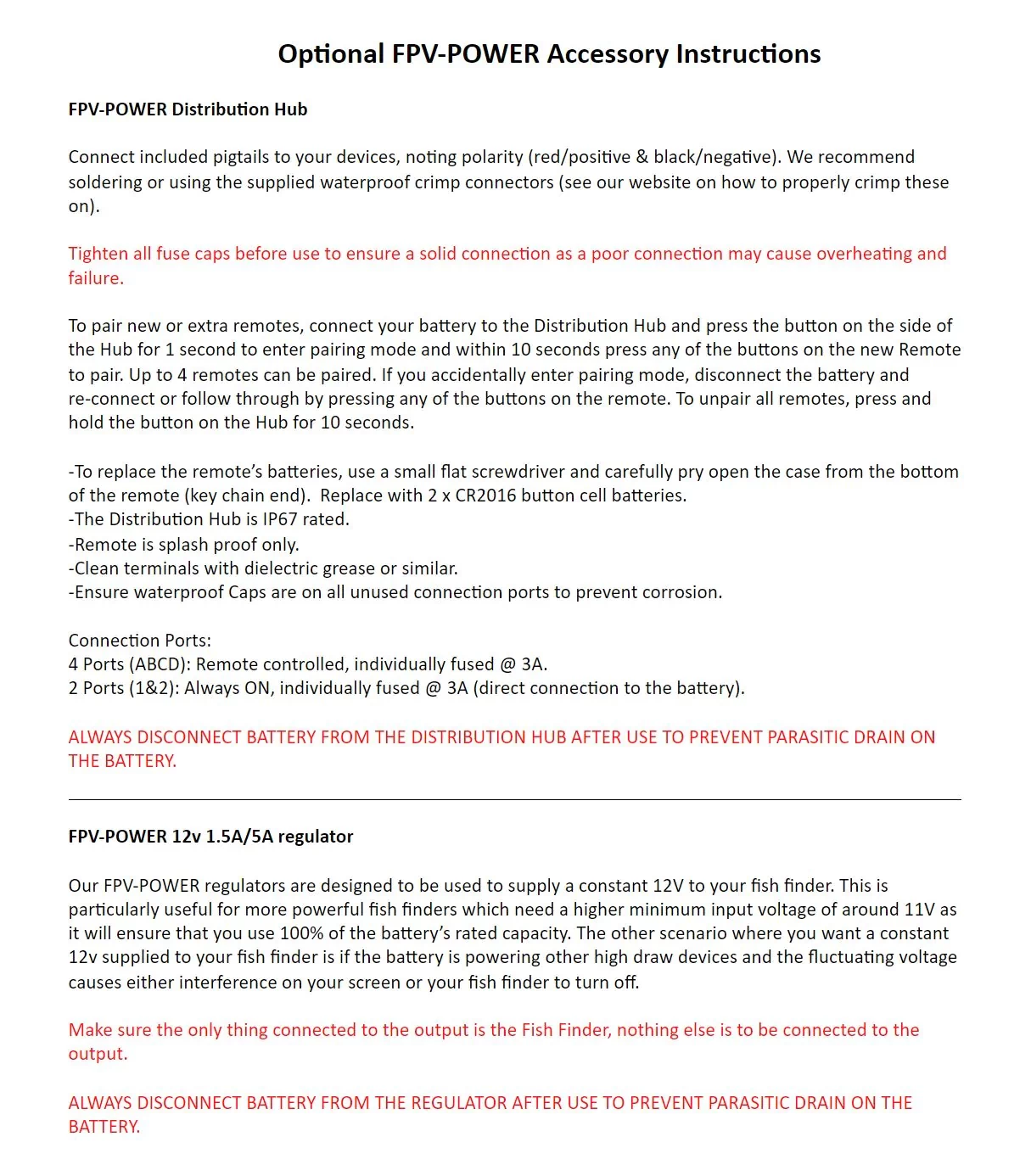 The FPV-POWER Distribution Hub is a plug and play solution for those wanting to power multiple items on their kayak, around the camp or in their campervan/caravan. With 4 ports that can be turned on/off via the supplied remote and 2 ports that are always on, the Distribution Hub is a neat compact solution to powering multiple items such as fish finder, lights, livewell and camera. Each port is individually fused and comes with its own cap, pigtail and waterproof crimps. The input lead also comes capped and matches perfectly with FPV’s 7ah and 17.5ah FPV-POWER packs. The whole unit is IP67 waterproof when the provided leads are capped or in use.