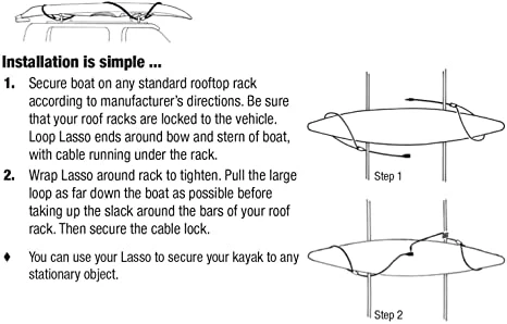 This system works by having 2 fixed loops one of which goes over either end of your kayak and is then pulled taut. The excess cable is wrapped around a fixed object like a roof rack or post and the two halves are locked by the integrated combination lock. The kayak can not be pulled out from either end because the loops are to tight to slide off the ends when the cable is locked and the loops won’t go around the belly of the kayak so it can’t be pulled through. (See instructions in pictures for more details)