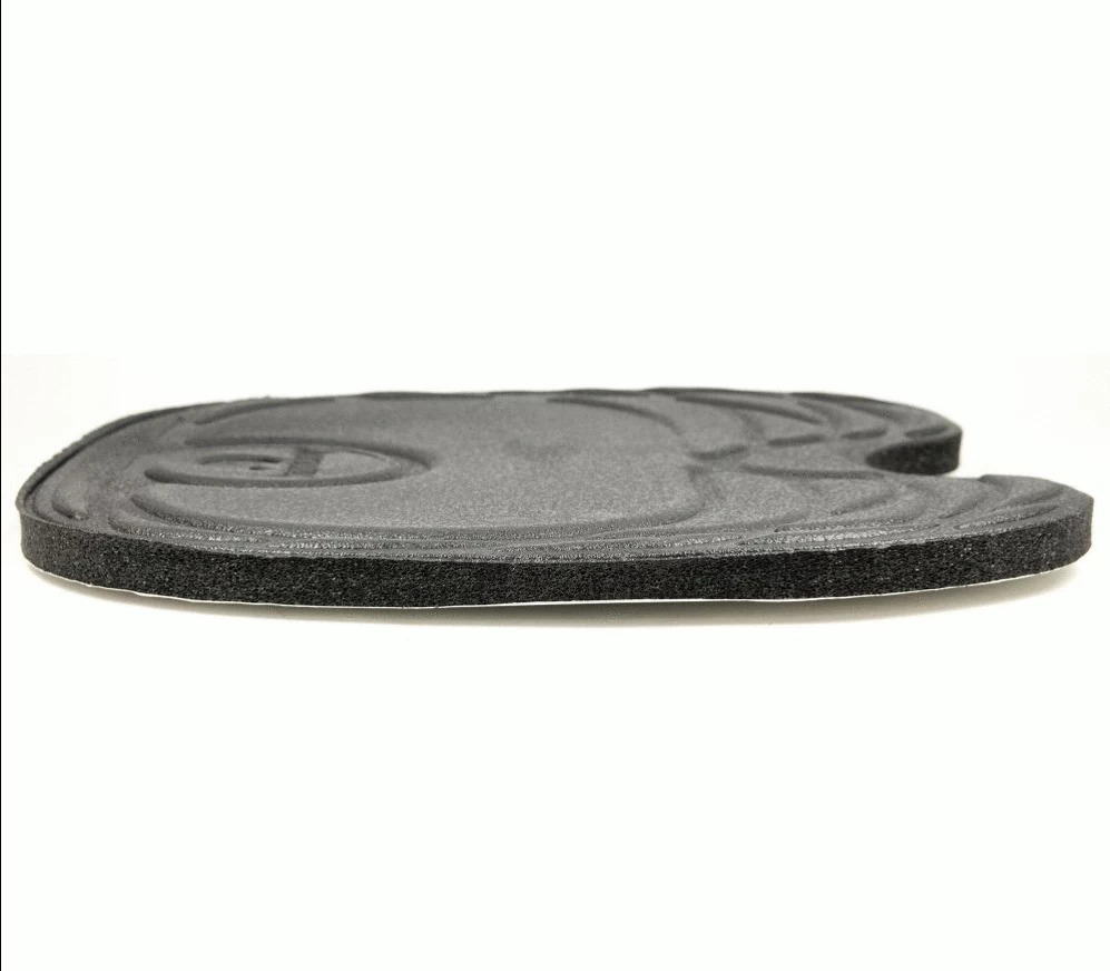 The Seat pad can be trimmed with a sharp knife and has some proud stylised curves to guide in the trimming process to easily ensure a symetrical neat job. The provided self-adhesive backing means installation is just peel and stick. Pad is 15 inches front to back by 16 inches side to side. Color is dark grey.