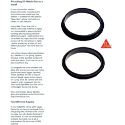 This hatch rim can basically be attached to all kayaks (e.g. fibreglass, reinforced plastics, polyethylene mixtures, ABS plastic etc). Before glueing, find out and confirm suitable glue and primer for both materials. The installation instruction for most common materials can be downloaded from the kajaksport web-pages and we have a copy in the photos below.