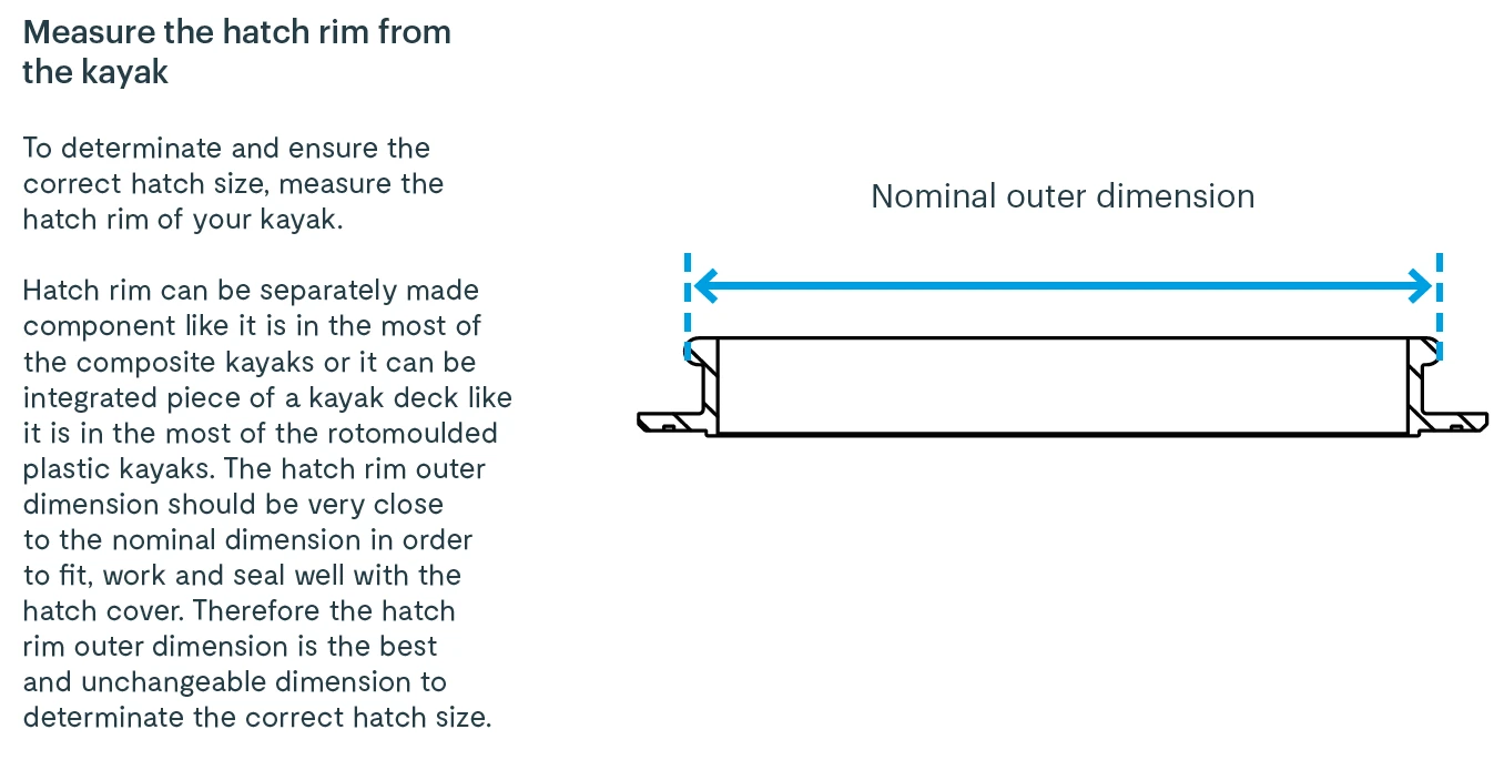Hatch rim can be separately made component like it is in the most of the composite kayaks or it can be integrated piece of a kayak deck like it is in the most of the rotomoulded plastic kayaks. The hatch rim outer dimension should be very close to the nominal dimension in order to fit, work and seal well with the hatch cover. Therefore the hatch rim outer dimension is the best and unchangeable dimension to determinate the correct hatch size.