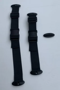 This complete strap is made up of 2 mounts, 2 lengths of 38mm (1 ½ inch) webbing strap (sewn into position on the elliptical mounts) joined by an adjustable length side release buckle, This makes one strap with a join in the middle. (This strap is available in 2 lengths- this is the 30cm length see below for the other length). These strap sets are normally used to hold down the hard hatch covers on kayaks that have a combination hard/ neoprene hatch closure system (e.g. Mission Eco Bezhig, Contour 490, Econizh etc.)