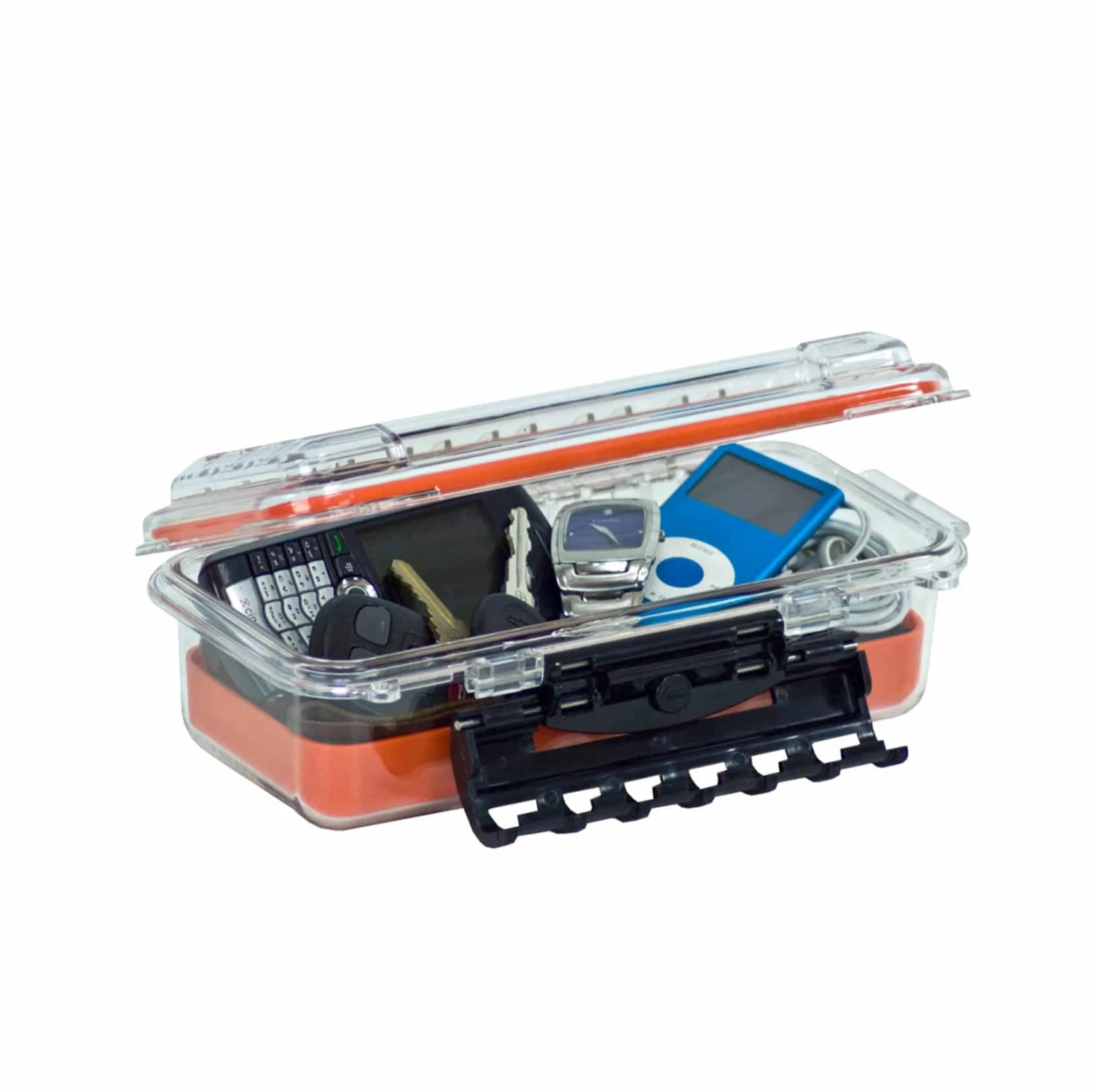 Plano’s Guide Series™ waterproof cases are the best protection on the water. Cam-action latches and a Dri-Loc® O-ring seal provide an airtight, waterproof environment so your valuables can travel with you worry-free. Even if they go overboard, contents stay safe in one meter of water for up to 30 minutes. This 3500 size is great for cell phones and wallets.