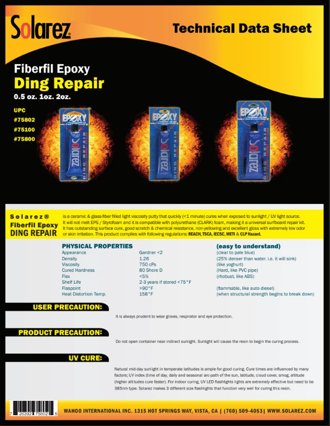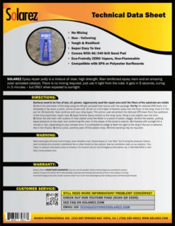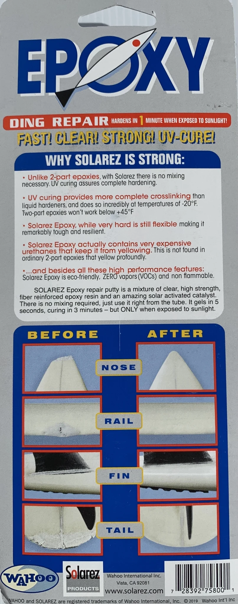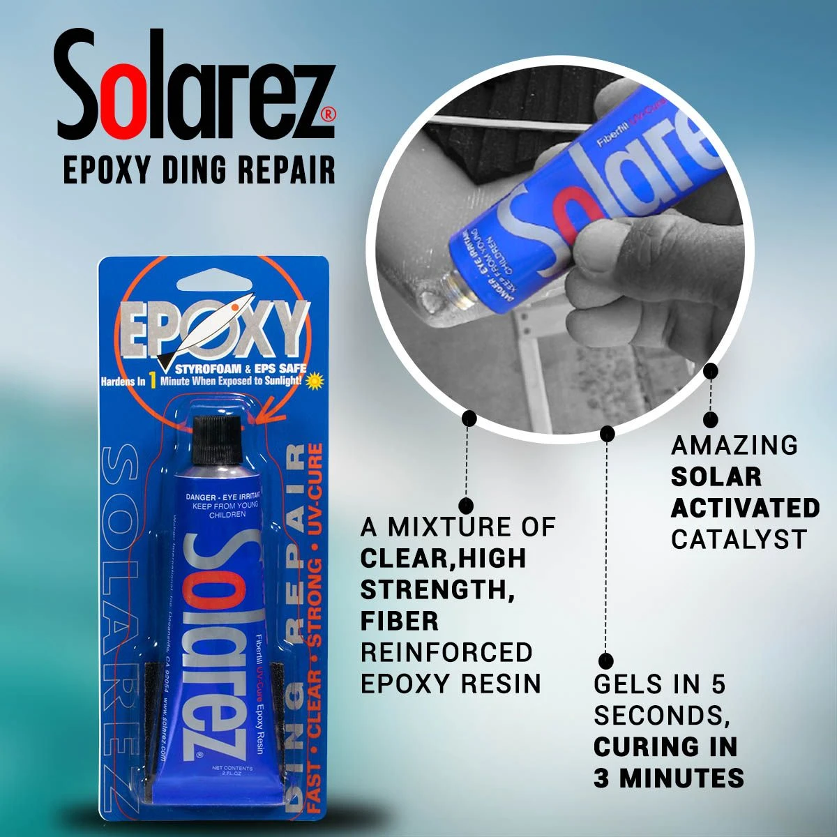 Solarez has glass and ceramic fibres in it which provides better adhesion, and impact resistance. That, coupled with a flexible resin gives Solarez Epoxy Ding Repair a tough, resilient finish. โ IN LESS THAN THREE MINUTES