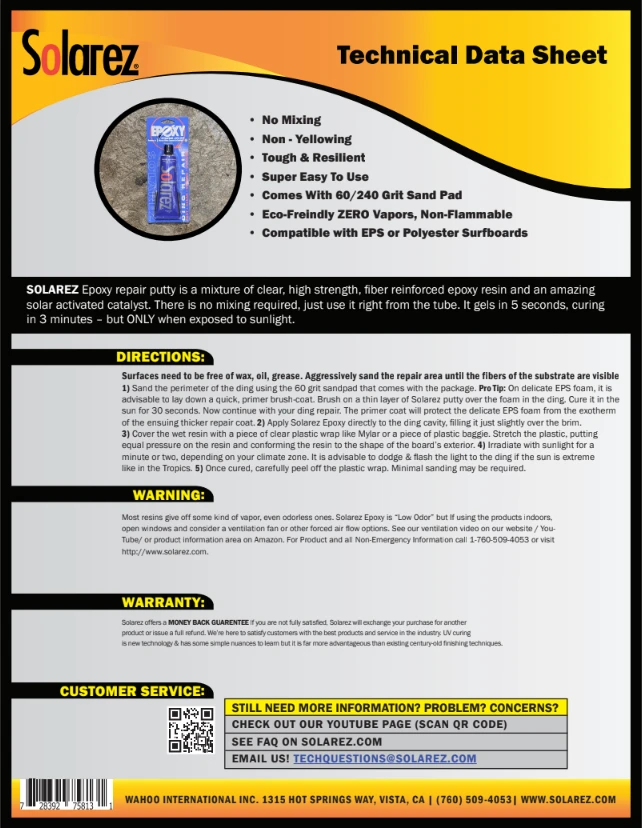 Solarrezโs tried & proven formula for over 20 years has saved many a kayak or surfboard from the perils of water ingress in countries all over the Globe. Simple to use: sand-prep (60 grit included) the surface around the ding, crack or small hole, squeeze out enough Solarez to fill the ding, cover the wet resin with a piece of plastic baggie, smooth it out (this is to aid the surface finish quality), and EXPOSE TO SUNLIGHT FOR A MINUTE OR TWO. Now, peel off the baggie and do some minor touch-up sanding with the 240 grit side (included) and GO SURF!