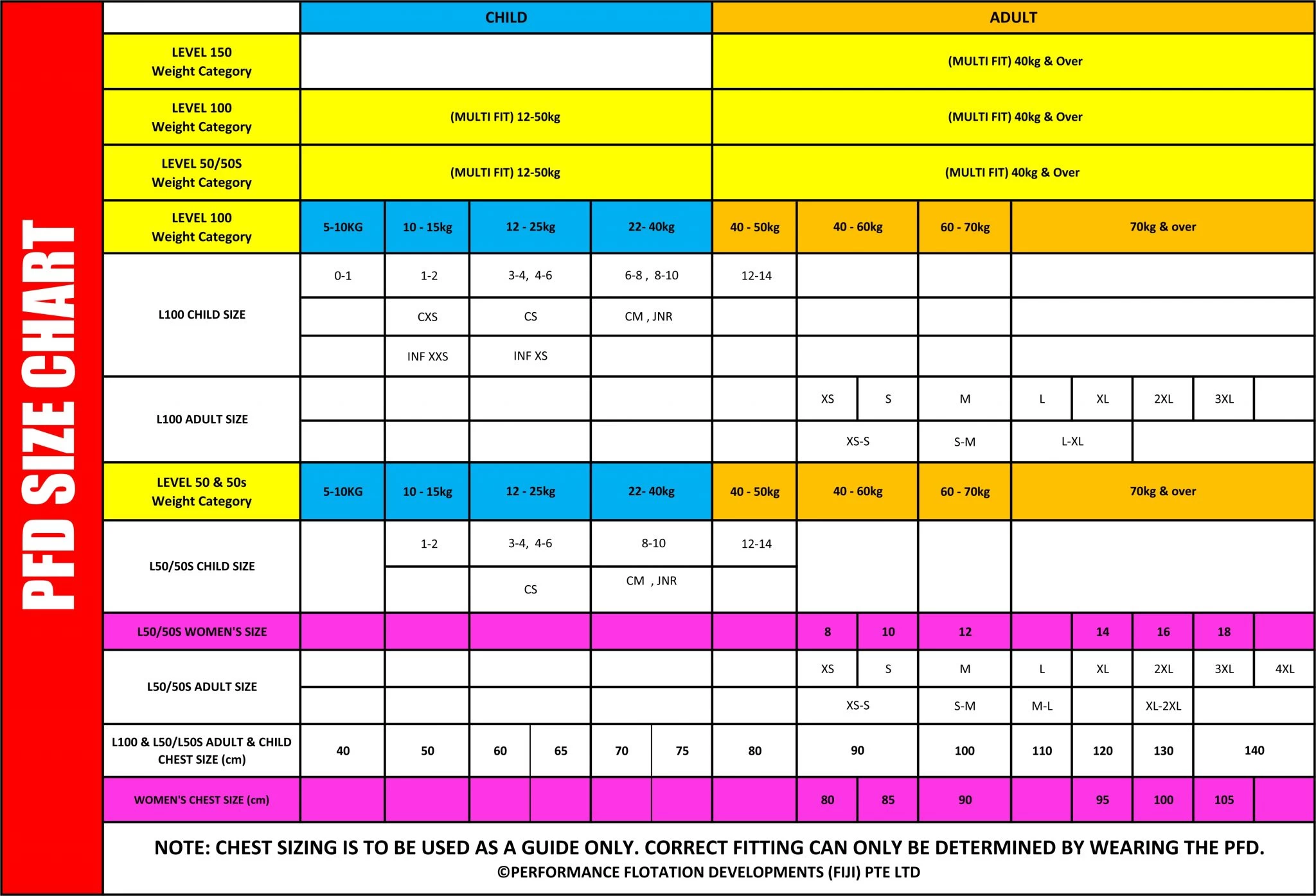 The sizes Extra Small to Extra Large will fit a wide range of sizes and the adjustable straps mean that the XL will fit much larger than other standard Extra Large PFDs in the Ultra Range.