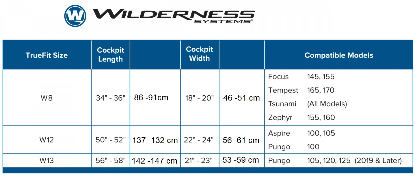 Please note that size W8 now replaces W7 – dimensions have been altered slightly to better fit the kayaks noted.